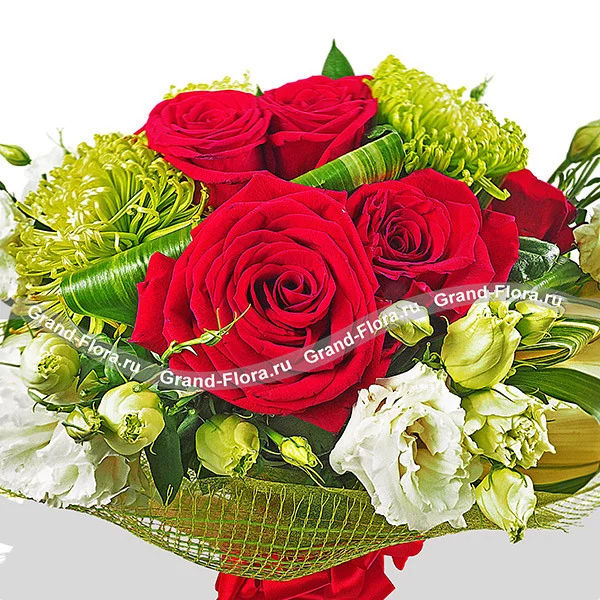 Стандартный (на фото): роза красная - 5 шт, хризантема одноголовая зеленая - 4 шт, эустома белая - 4 шт, лист аспидистры загнутый - 5 шт, сетка зеленая. Примерный размер: 25Х25 см.