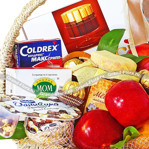 Люкс: коробка конфет "Merci" - 1 шт, шоколад"Коркунов" - 1 шт, чай "Lipton"(черный) - 1 шт,конфеты "Ferrero Rocher" - 1 шт, даниссимо - 1 шт, мед (500г.) - 1 шт, Coldrex МАКС Грипп - 1уп., Доктор МОМ - 1 шт, гранат - 1 шт, лимон - 1 шт, яблоки - 0,5 кг, мандарины - 0,5 кг, корзина большая, декор.