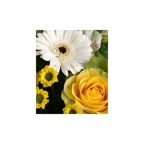 Состав: роза желтая - 3 шт, гербера белая - 2 шт, альстромерия белая - 2 шт, хризантема кустовая желтая- 3 шт, декоративная зелень, сетка